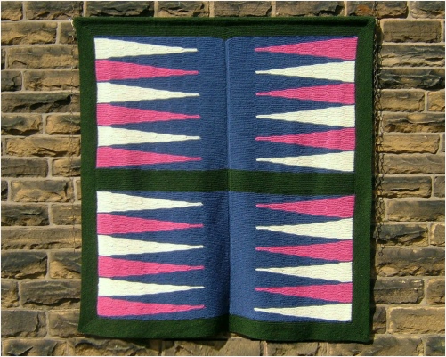 An afghan that can also be used as a floor game! This knitted afghan is a large scale version of the traditional board game. It has knitted playing pieces.
