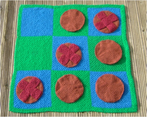 The playing pieces are circles worked in trebles (UK definition). The crosses are five small granny squares, stitched together.