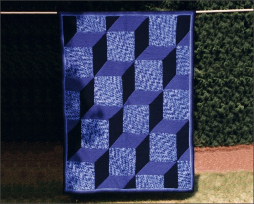 The design was probably inspired by finding the blue variegated yarns and two matching plain blue yarns. Variegated yarns create an unusual effect when they are used diagonally. There is no suggestion of the spots or stripes you usually get with such yarns. Using the variegated yarn for the squares gives large areas of apparent texture for the fronts of the cubes. Any three colours would work to give the effect of cubes.